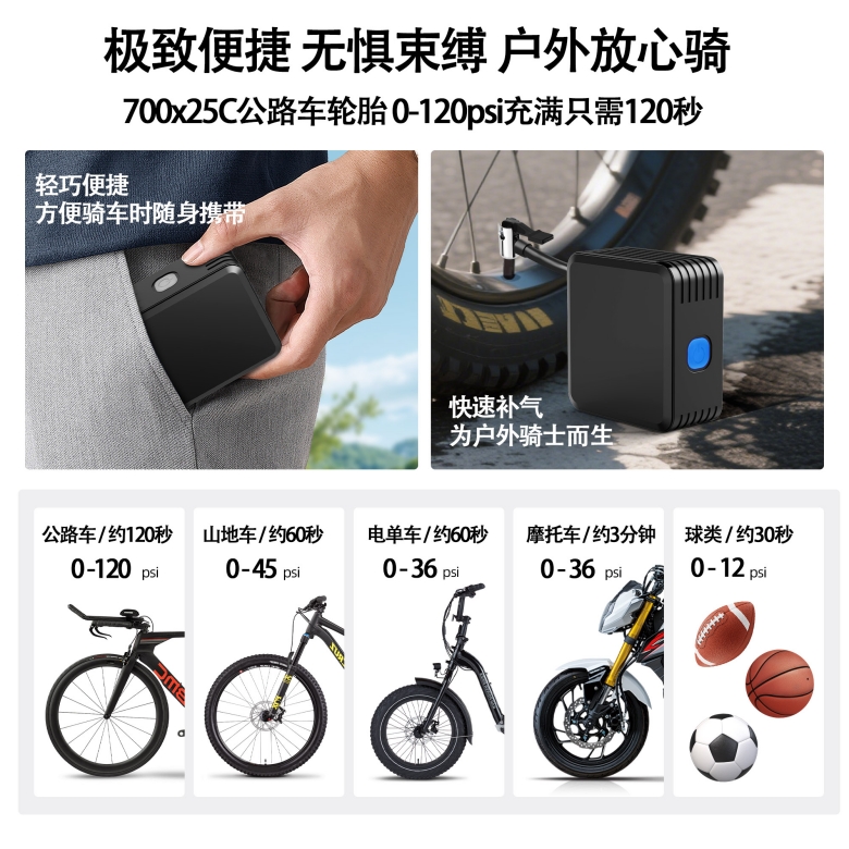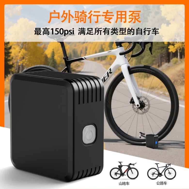 【强大的充气和快速充电】这款电动自行车泵虽然体积小,但可提供高达 150PSI 的气压,确保为您的公路自行车或山地车快速有效地充轮胎。 当您需要为迷你自行车泵充电时,使用随附的Type-C充电线,仅需 2小时。 一次充电可给 10 个轮胎充气至 150PSI, 您将为更 长的骑行做好准备。